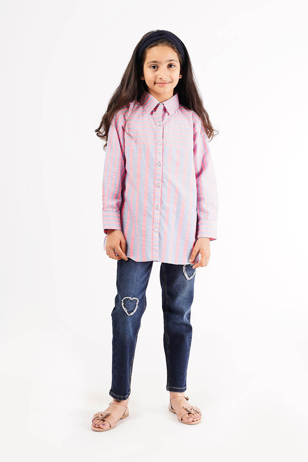 Collared shirt with long sleeves. Button-up front in Pink and grey stripes played vertically and horizontally along the garment to give the Spring Summer Festive Vibe.